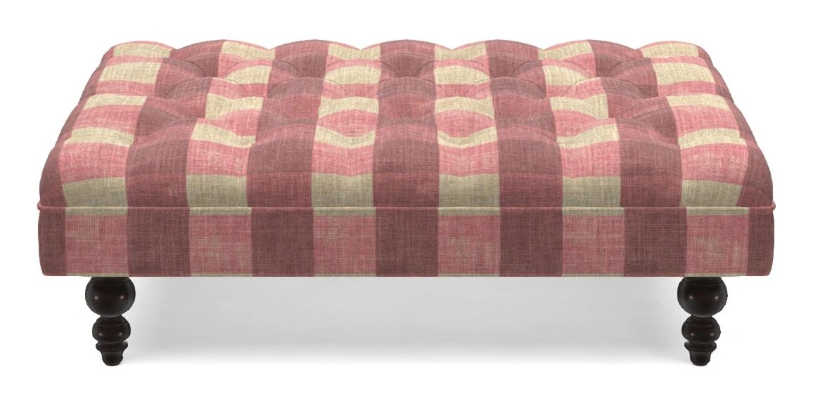A traditionally styled, large, low rectangular footstool featuring classic buttoning and solid hardwood turned feet.
