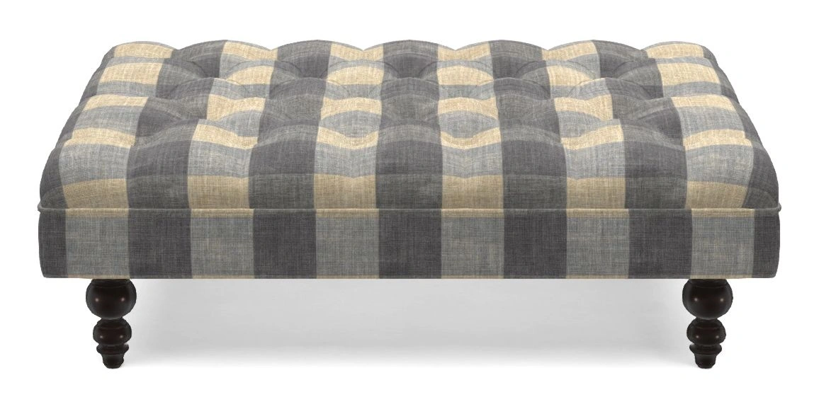 A traditionally styled, large, low rectangular footstool featuring classic buttoning and solid hardwood turned feet.