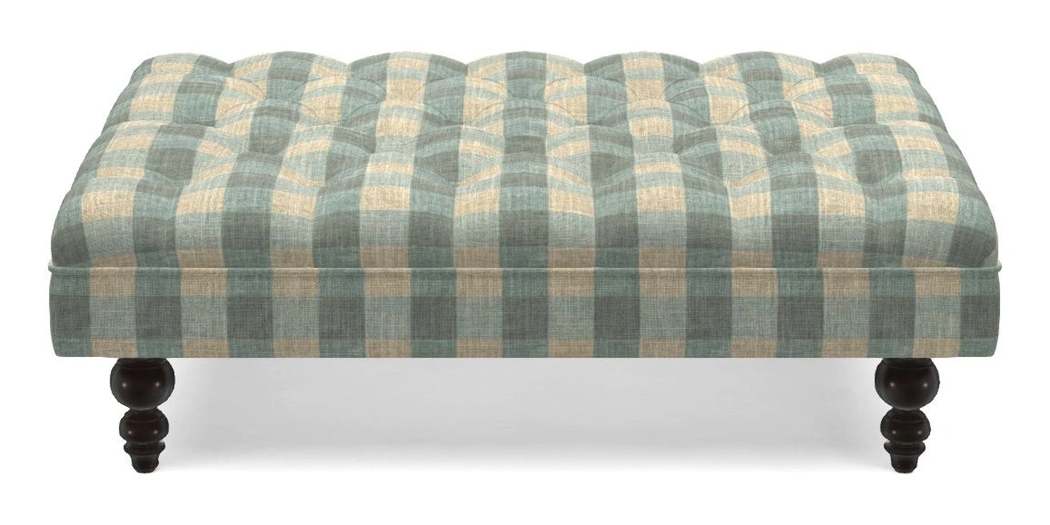 A traditionally styled, large, low rectangular footstool featuring classic buttoning and solid hardwood turned feet.