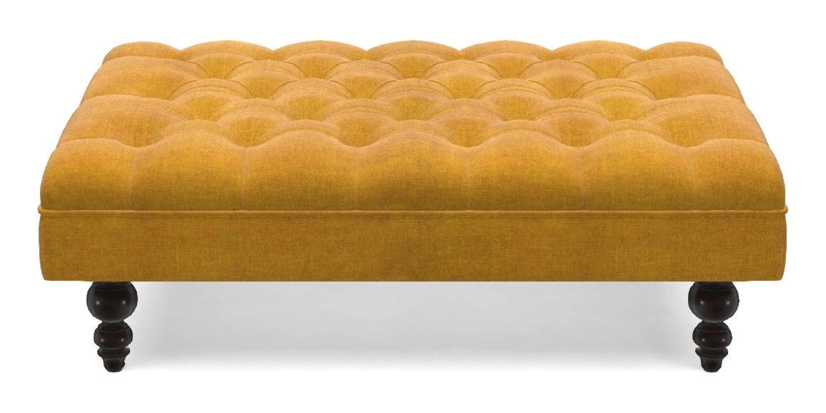 A traditionally styled, large, low rectangular footstool featuring classic buttoning and solid hardwood turned feet.