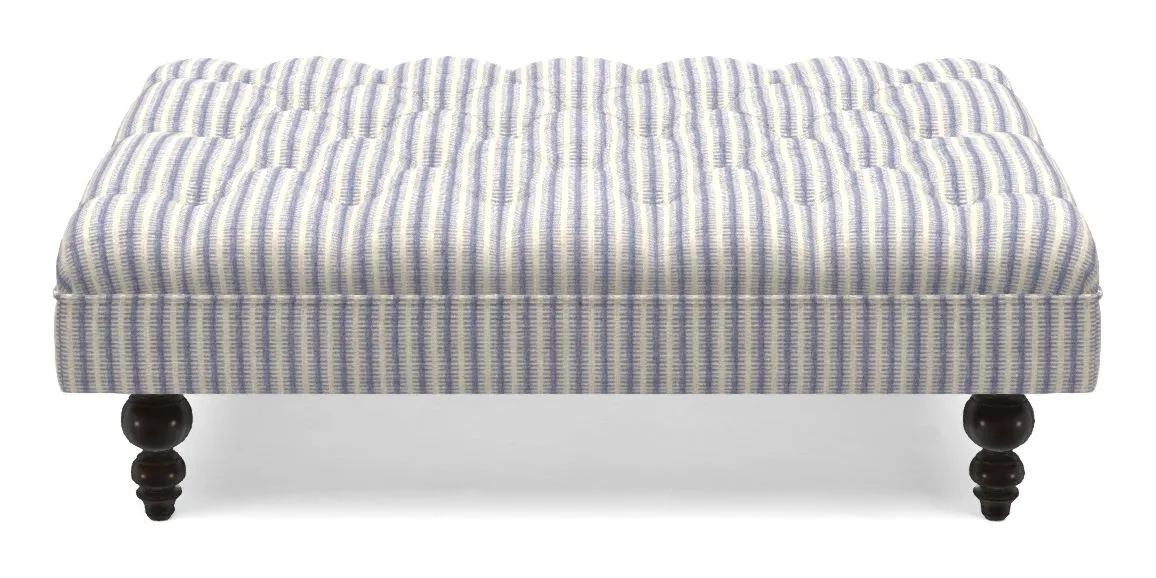 A traditionally styled, large, low rectangular footstool featuring classic buttoning and solid hardwood turned feet.