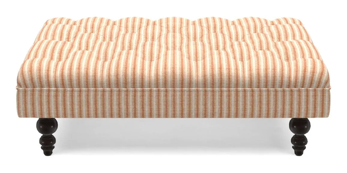 A traditionally styled, large, low rectangular footstool featuring classic buttoning and solid hardwood turned feet.