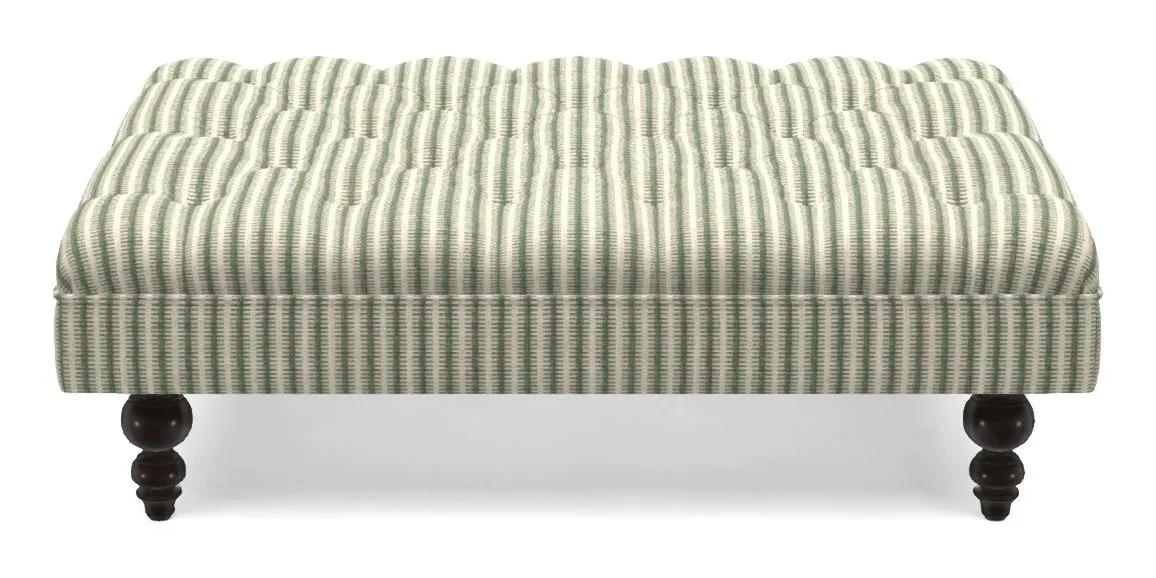 A traditionally styled, large, low rectangular footstool featuring classic buttoning and solid hardwood turned feet.