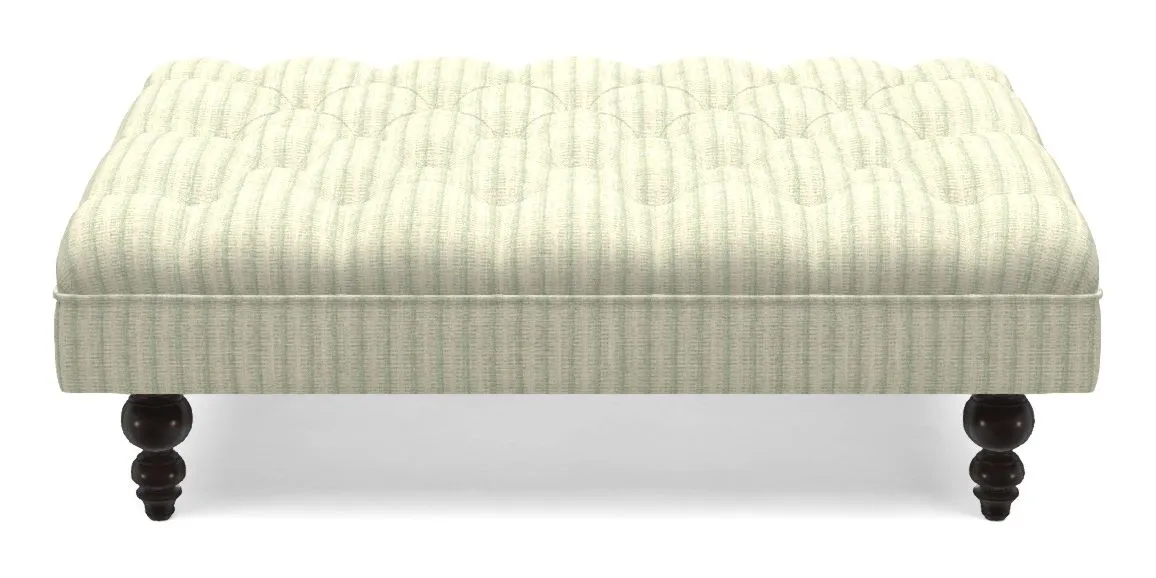 A traditionally styled, large, low rectangular footstool featuring classic buttoning and solid hardwood turned feet.