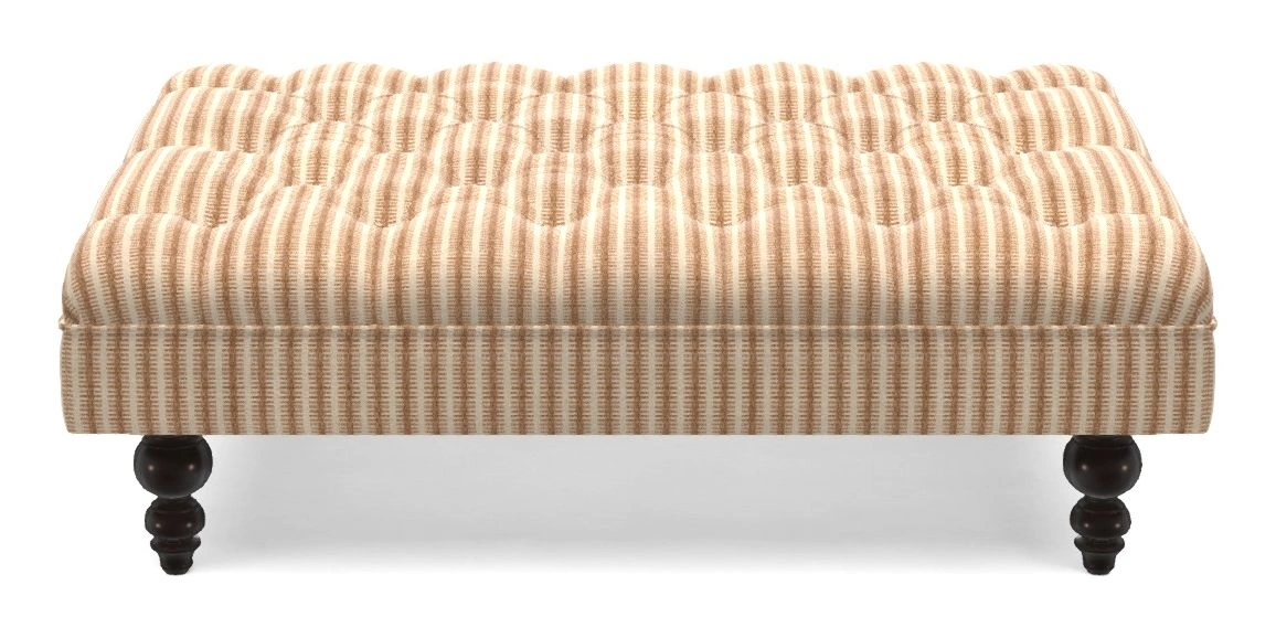 A traditionally styled, large, low rectangular footstool featuring classic buttoning and solid hardwood turned feet.