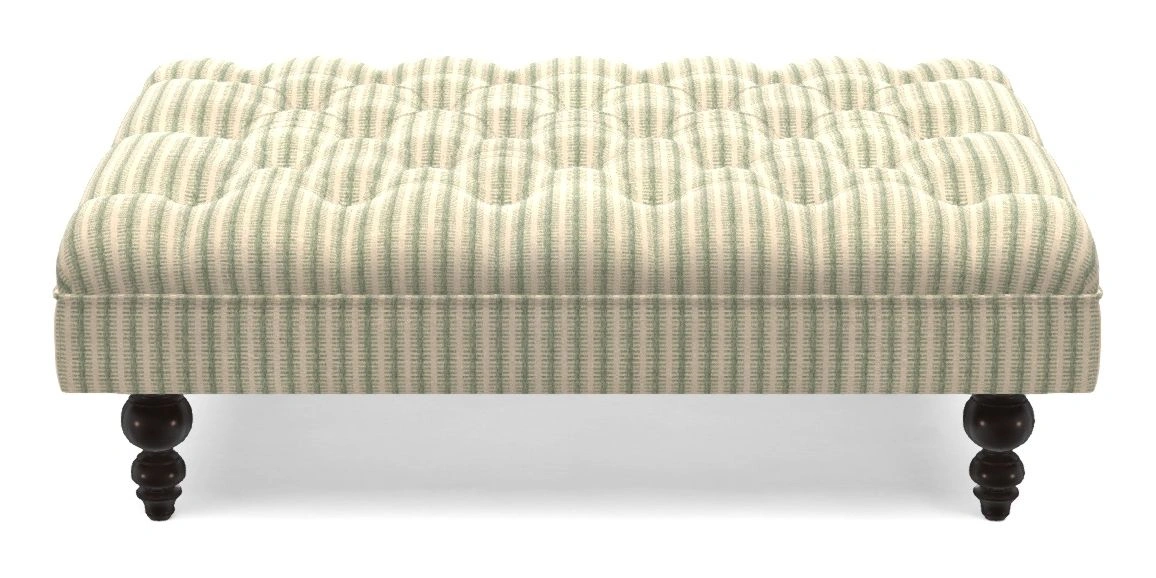 A traditionally styled, large, low rectangular footstool featuring classic buttoning and solid hardwood turned feet.