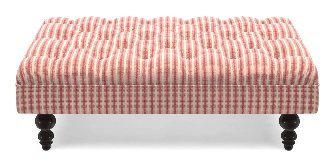 A traditionally styled, large, low rectangular footstool featuring classic buttoning and solid hardwood turned feet.
