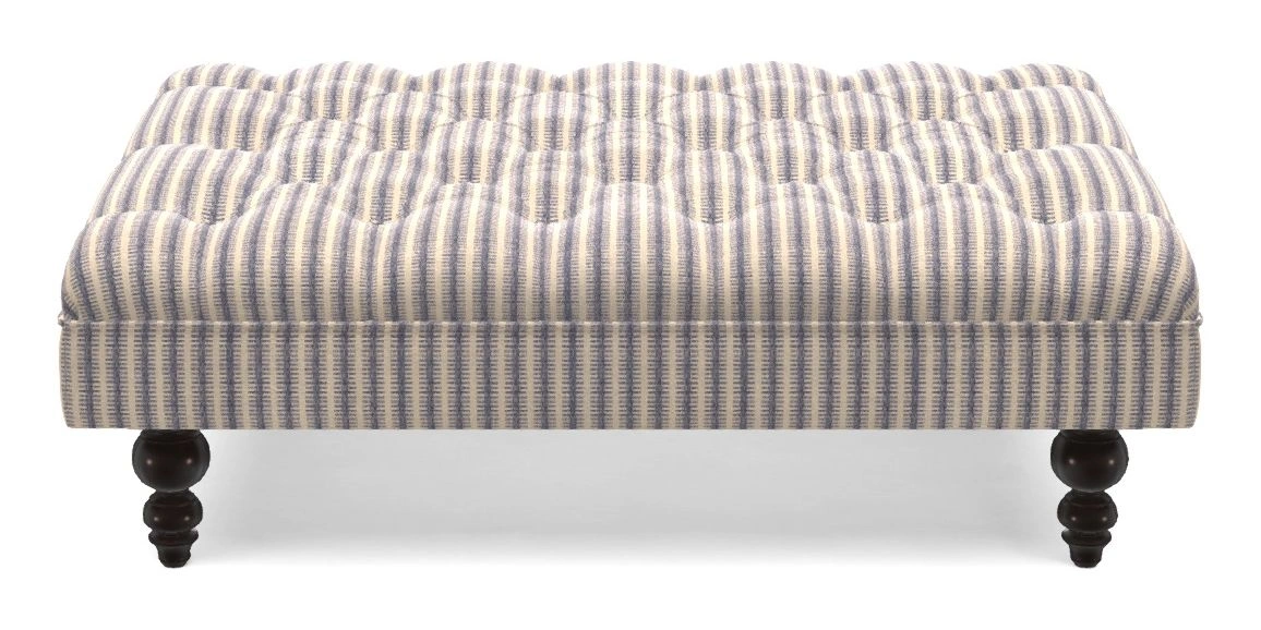 A traditionally styled, large, low rectangular footstool featuring classic buttoning and solid hardwood turned feet.