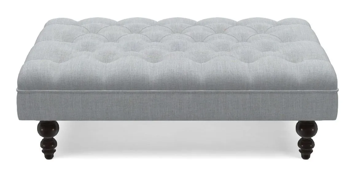 A traditionally styled, large, low rectangular footstool featuring classic buttoning and solid hardwood turned feet.