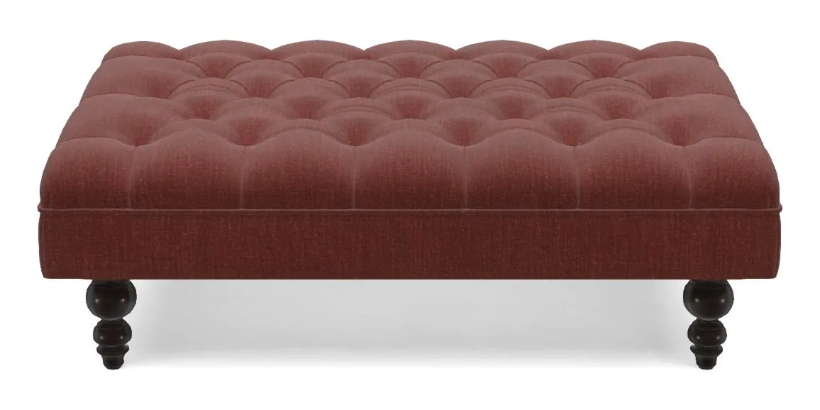 A traditionally styled, large, low rectangular footstool featuring classic buttoning and solid hardwood turned feet.