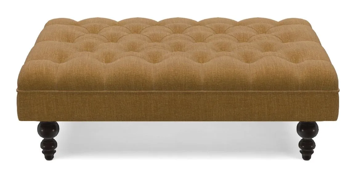 A traditionally styled, large, low rectangular footstool featuring classic buttoning and solid hardwood turned feet.