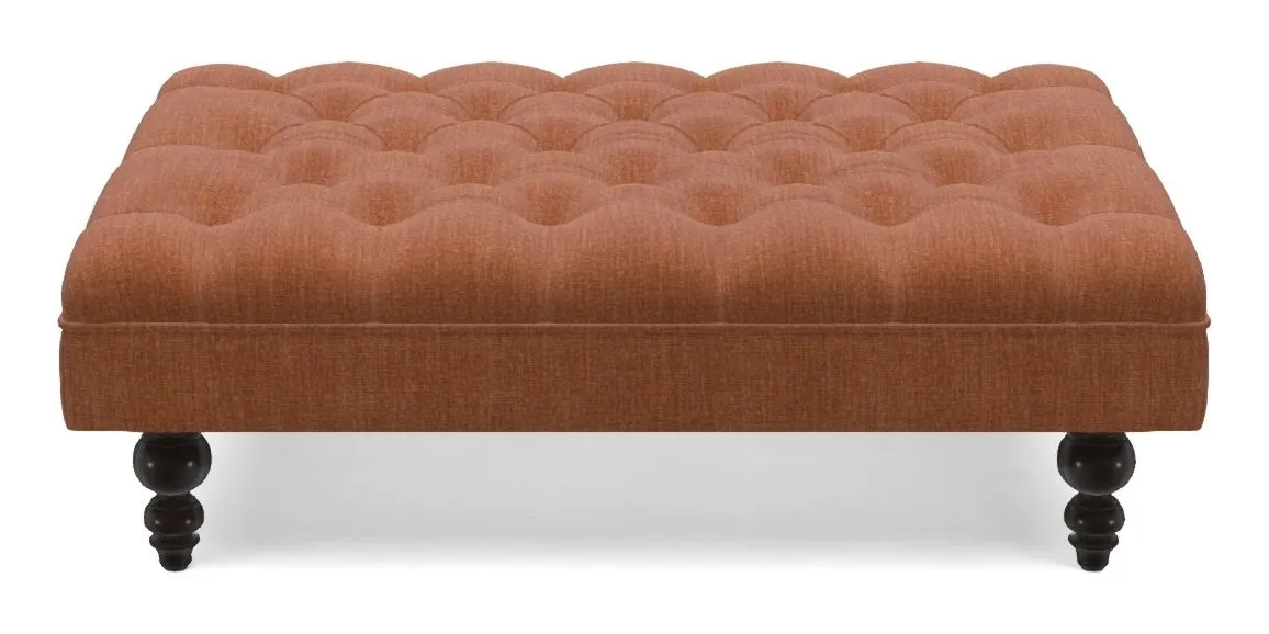 A traditionally styled, large, low rectangular footstool featuring classic buttoning and solid hardwood turned feet.