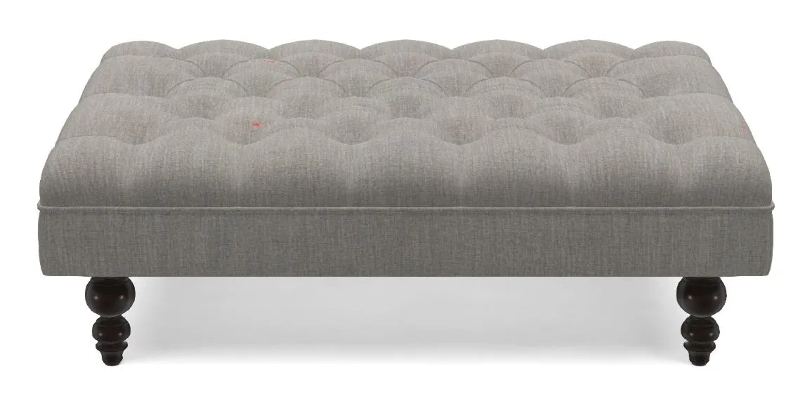 A traditionally styled, large, low rectangular footstool featuring classic buttoning and solid hardwood turned feet.