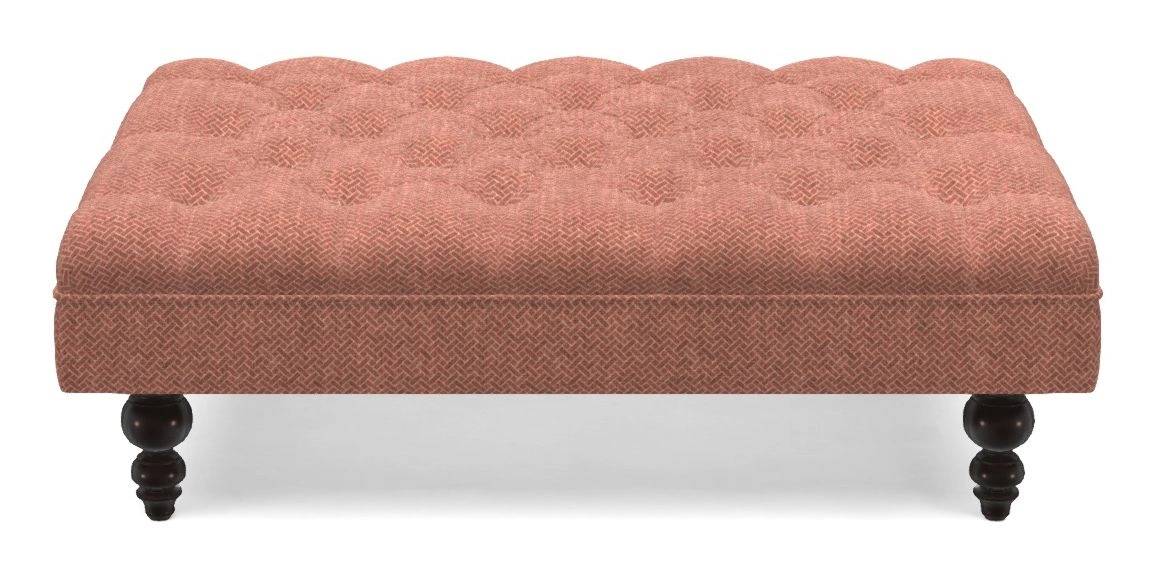 A traditionally styled, large, low rectangular footstool featuring classic buttoning and solid hardwood turned feet.