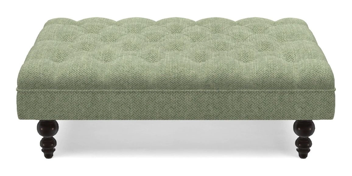 A traditionally styled, large, low rectangular footstool featuring classic buttoning and solid hardwood turned feet.