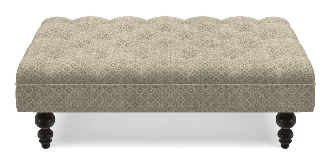 A traditionally styled, large, low rectangular footstool featuring classic buttoning and solid hardwood turned feet.