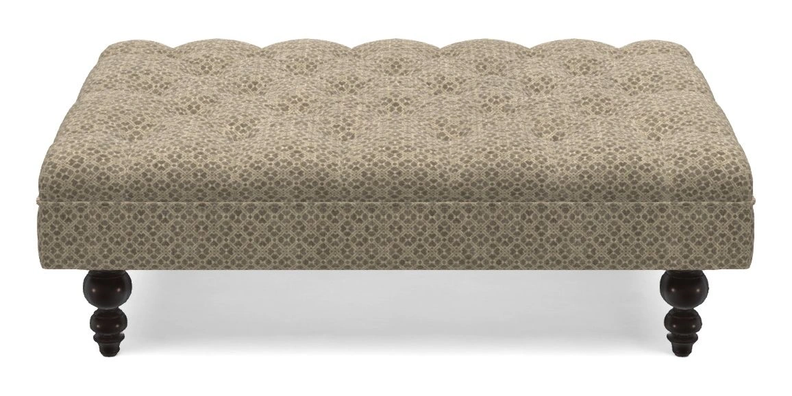 A traditionally styled, large, low rectangular footstool featuring classic buttoning and solid hardwood turned feet.