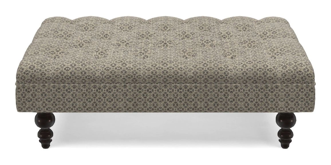 A traditionally styled, large, low rectangular footstool featuring classic buttoning and solid hardwood turned feet.
