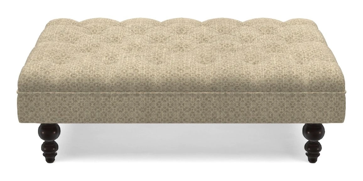 A traditionally styled, large, low rectangular footstool featuring classic buttoning and solid hardwood turned feet.