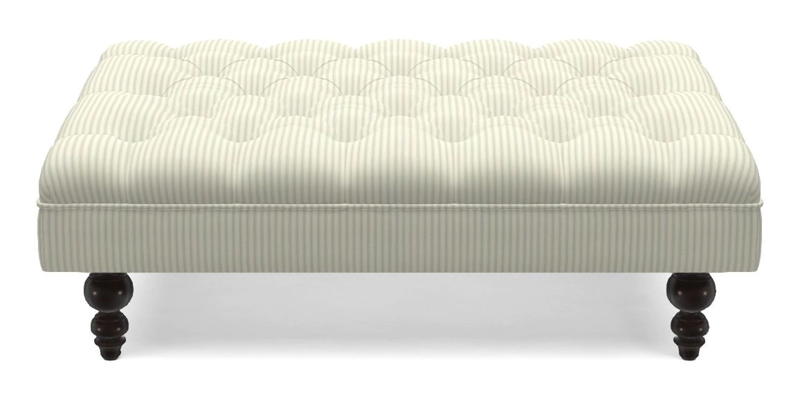 A traditionally styled, large, low rectangular footstool featuring classic buttoning and solid hardwood turned feet.