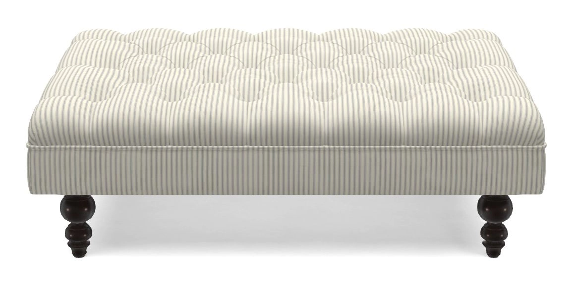 A traditionally styled, large, low rectangular footstool featuring classic buttoning and solid hardwood turned feet.
