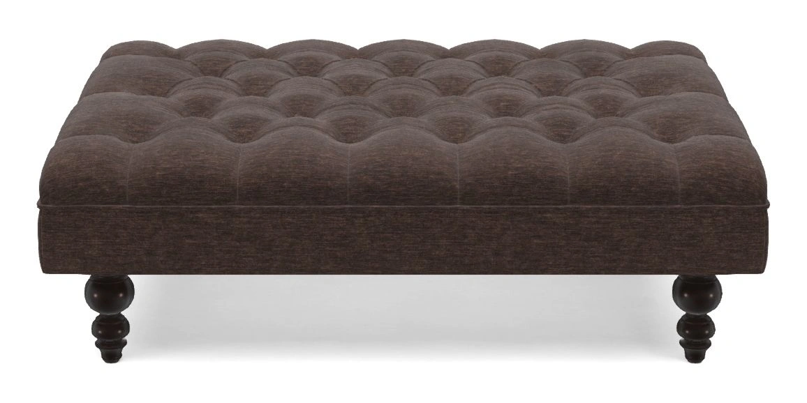 A traditionally styled, large, low rectangular footstool featuring classic buttoning and solid hardwood turned feet.