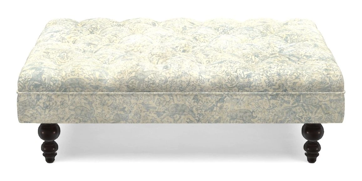 A traditionally styled, large, low rectangular footstool featuring classic buttoning and solid hardwood turned feet.