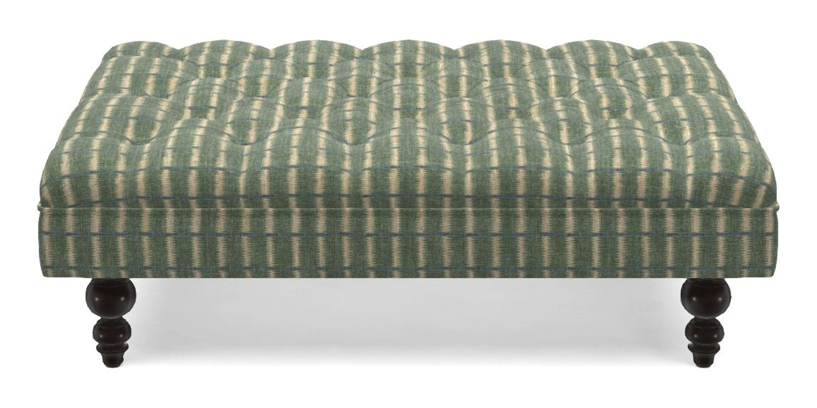 A traditionally styled, large, low rectangular footstool featuring classic buttoning and solid hardwood turned feet.
