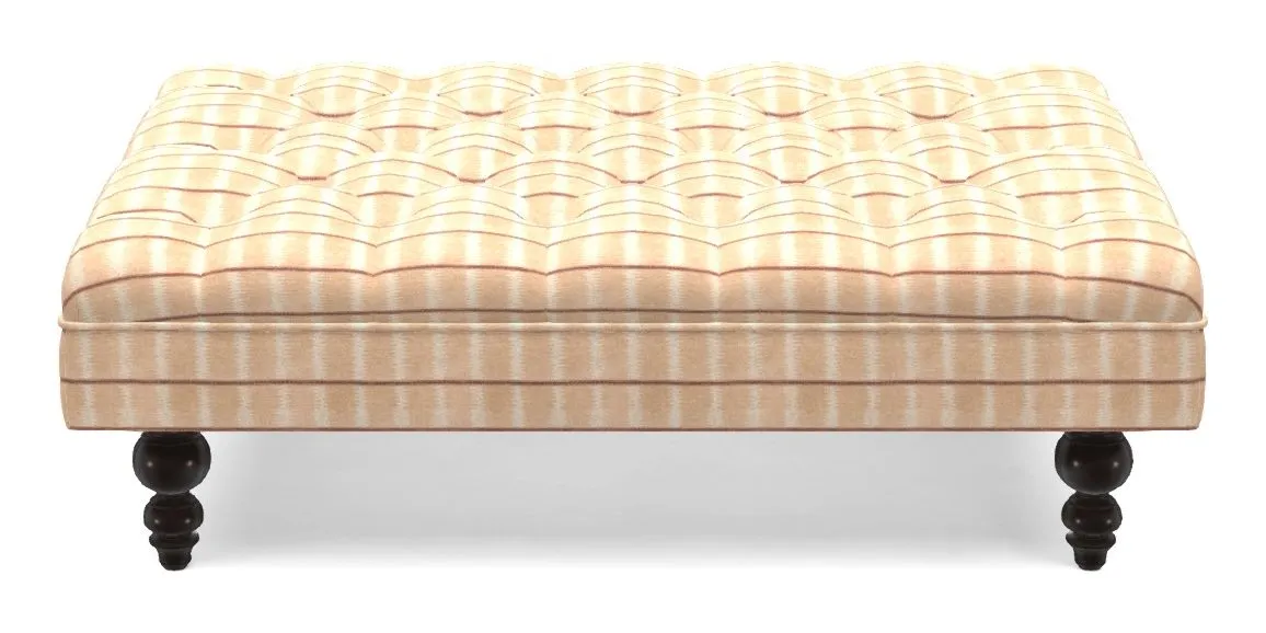A traditionally styled, large, low rectangular footstool featuring classic buttoning and solid hardwood turned feet.