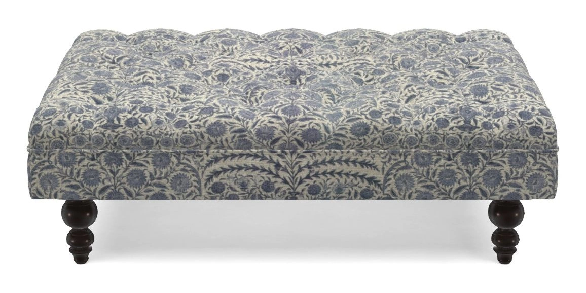A traditionally styled, large, low rectangular footstool featuring classic buttoning and solid hardwood turned feet.