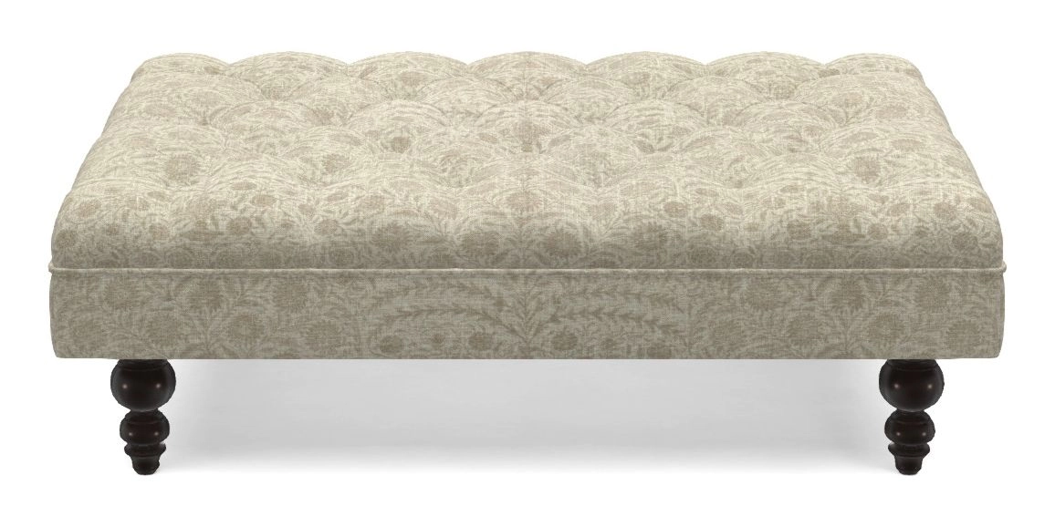 A traditionally styled, large, low rectangular footstool featuring classic buttoning and solid hardwood turned feet.