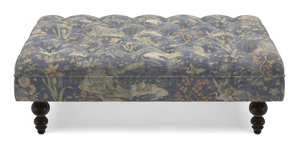 A traditionally styled, large, low rectangular footstool featuring classic buttoning and solid hardwood turned feet.