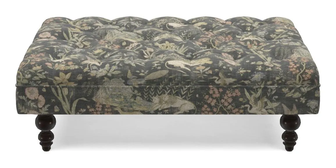 A traditionally styled, large, low rectangular footstool featuring classic buttoning and solid hardwood turned feet.