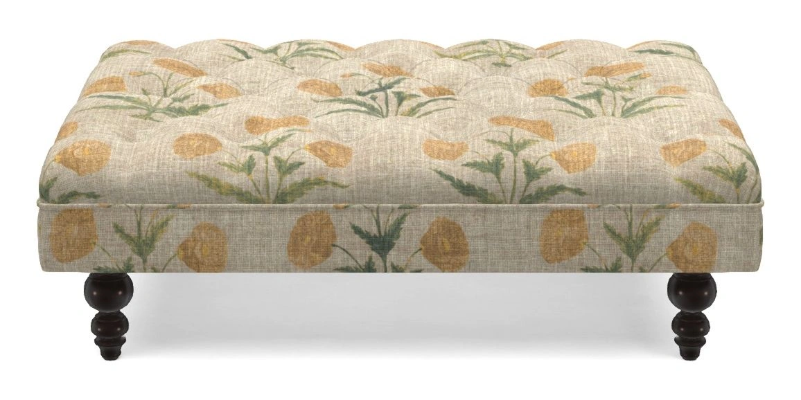 A traditionally styled, large, low rectangular footstool featuring classic buttoning and solid hardwood turned feet.