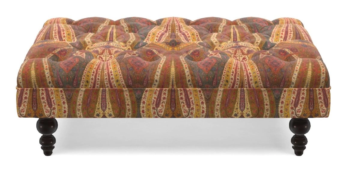A traditionally styled, large, low rectangular footstool featuring classic buttoning and solid hardwood turned feet.