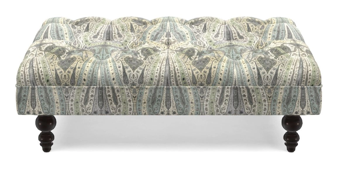 A traditionally styled, large, low rectangular footstool featuring classic buttoning and solid hardwood turned feet.