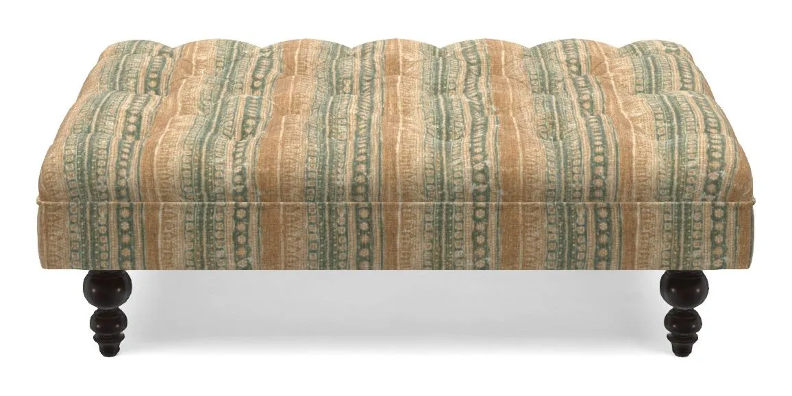 A traditionally styled, large, low rectangular footstool featuring classic buttoning and solid hardwood turned feet.
