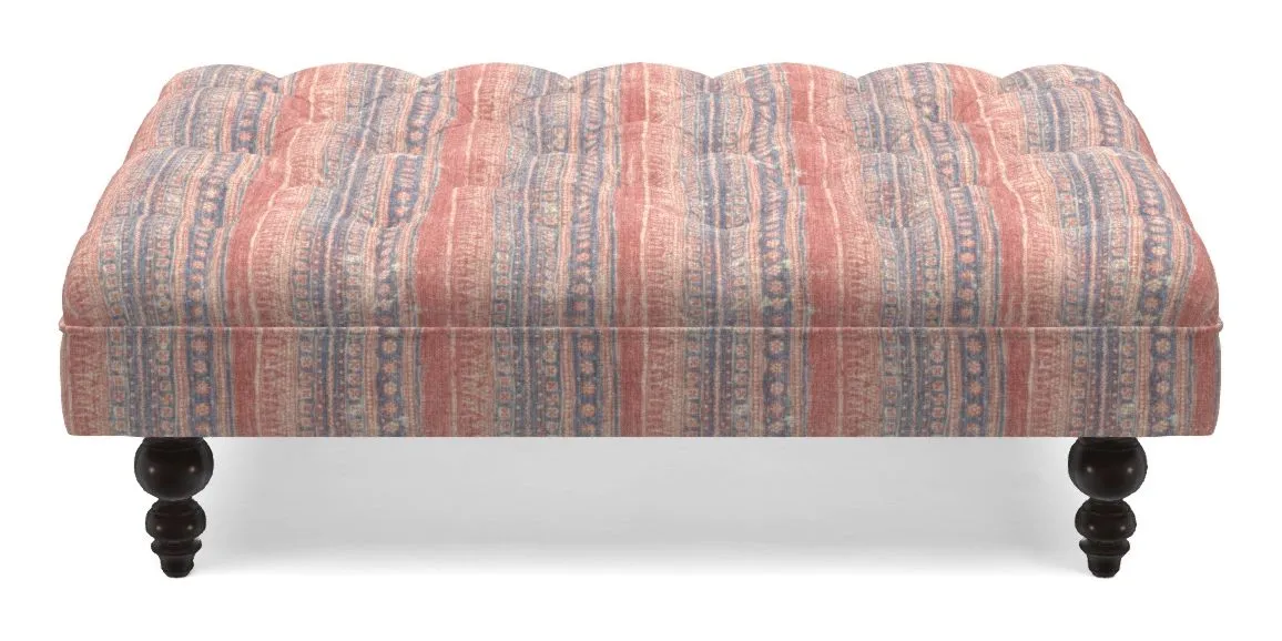 A traditionally styled, large, low rectangular footstool featuring classic buttoning and solid hardwood turned feet.