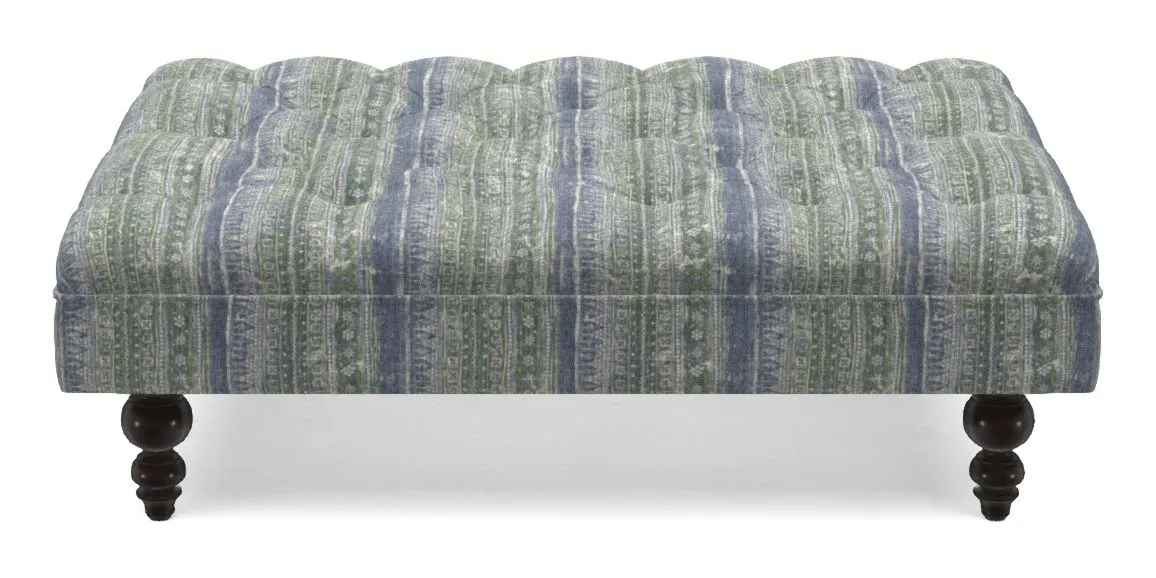 A traditionally styled, large, low rectangular footstool featuring classic buttoning and solid hardwood turned feet.