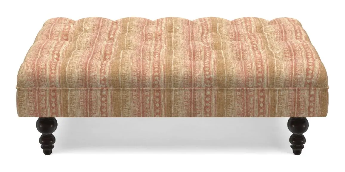 A traditionally styled, large, low rectangular footstool featuring classic buttoning and solid hardwood turned feet.