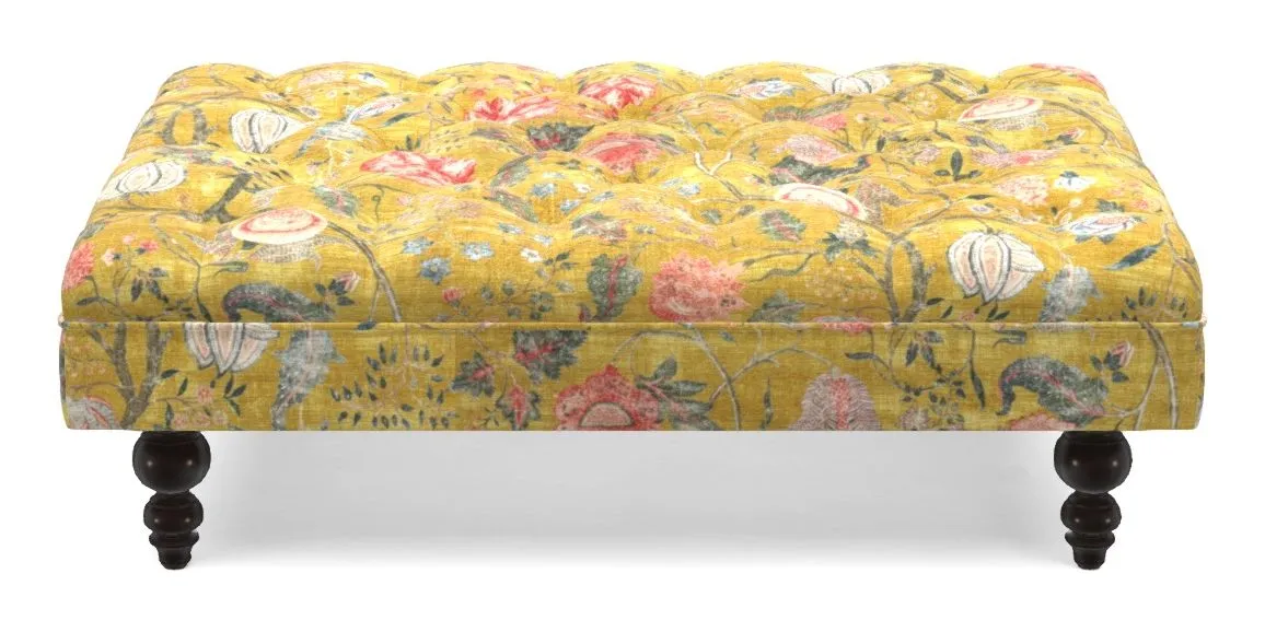 A traditionally styled, large, low rectangular footstool featuring classic buttoning and solid hardwood turned feet.