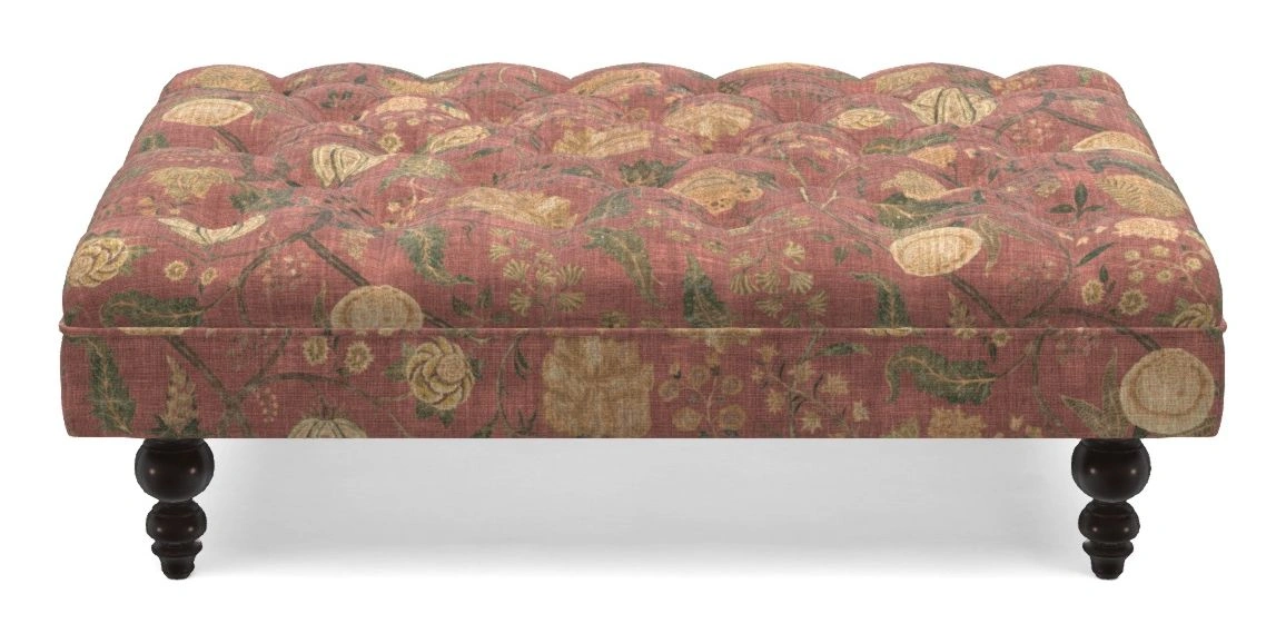 A traditionally styled, large, low rectangular footstool featuring classic buttoning and solid hardwood turned feet.