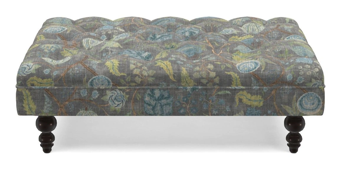 A traditionally styled, large, low rectangular footstool featuring classic buttoning and solid hardwood turned feet.