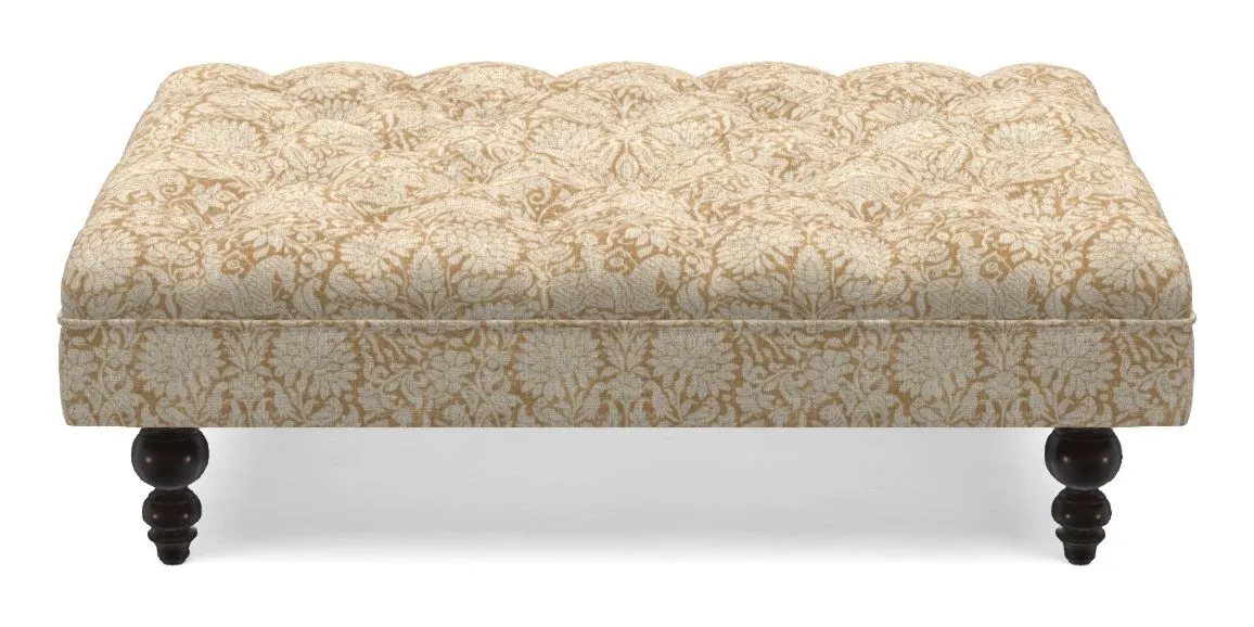 A traditionally styled, large, low rectangular footstool featuring classic buttoning and solid hardwood turned feet.
