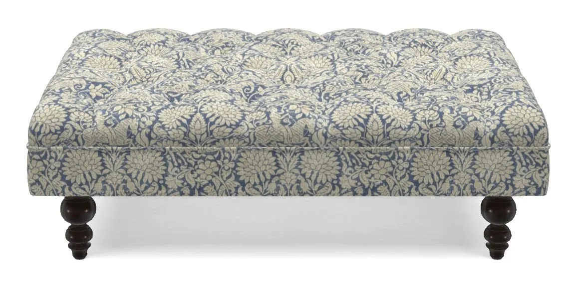 A traditionally styled, large, low rectangular footstool featuring classic buttoning and solid hardwood turned feet.