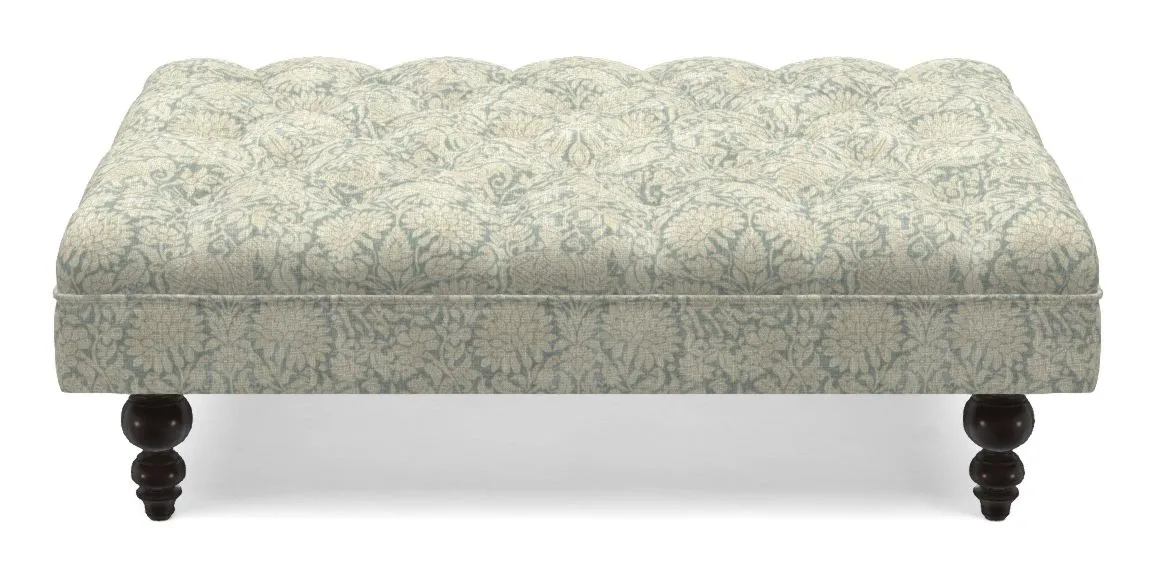 A traditionally styled, large, low rectangular footstool featuring classic buttoning and solid hardwood turned feet.