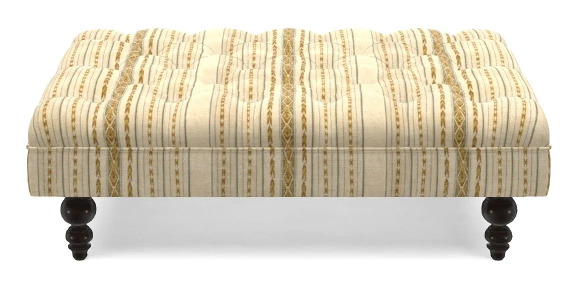 A traditionally styled, large, low rectangular footstool featuring classic buttoning and solid hardwood turned feet.
