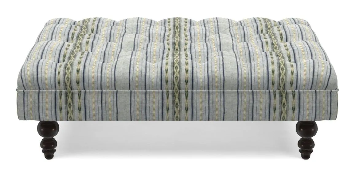 A traditionally styled, large, low rectangular footstool featuring classic buttoning and solid hardwood turned feet.