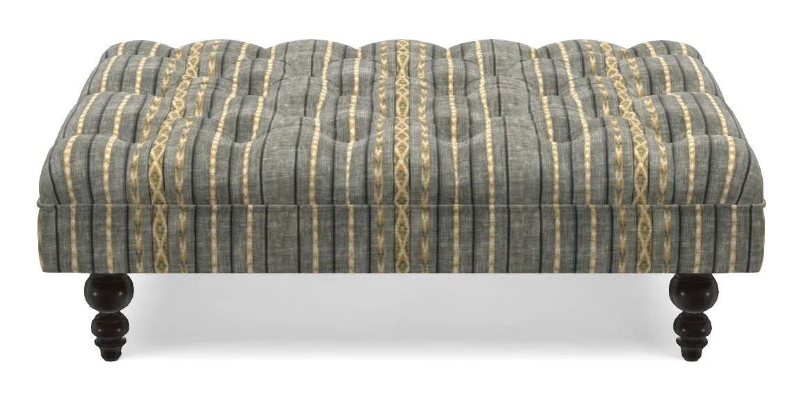 A traditionally styled, large, low rectangular footstool featuring classic buttoning and solid hardwood turned feet.