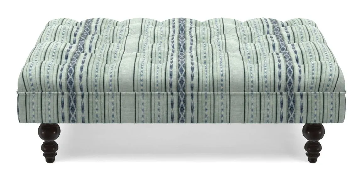 A traditionally styled, large, low rectangular footstool featuring classic buttoning and solid hardwood turned feet.